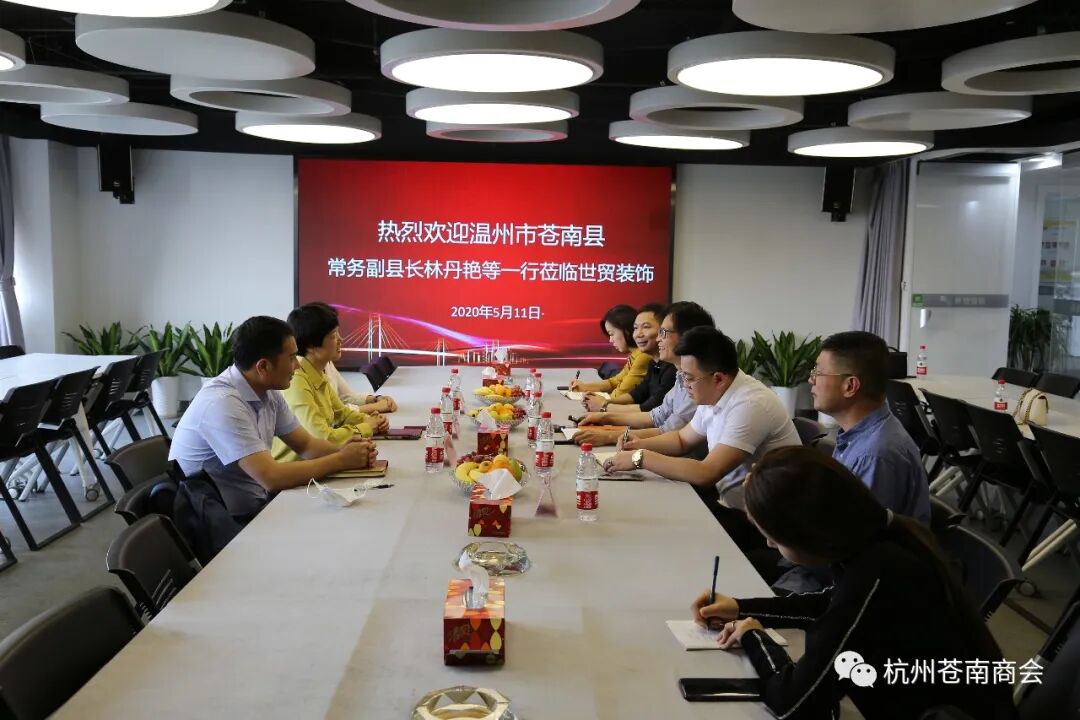 座谈会在会长企业浙江世贸装饰股份有限公司会议室召开。杭州市苍南商会会长陈志福对林丹艳常务副县长一行的到来表示诚挚地欢迎,并向家乡领导整体介绍了杭州市苍南商会的发展历程、组织架构、办会理念及会员企业的概况。
